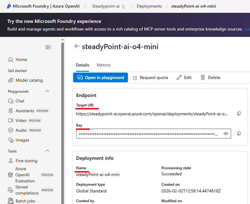 - Copy Target URL & key & Deployment name
